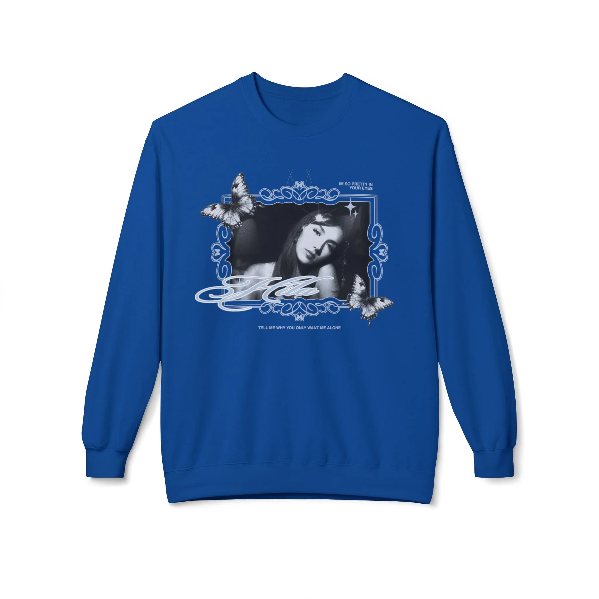 Soft, slightly oversized, and quietly nostalgic — this crewneck wraps you in a calm, retro mood. The grayscale portrait and delicate butterflies float across the chest like a memory caught between pages. Wear it on slow mornings with coffee, late-night record sessions, or when you want an extra layer that reads like a thoughtful statement rather than loud branding. The dropped shoulders and roomy fit give a relaxed silhouette that moves with you. It feels substantial without being stiff: that medium-heavy fabric holds its shape while staying cozy through seasons. Simple, wearable, and lived-in — for moments when comfort and a gentle aesthetic matter most.